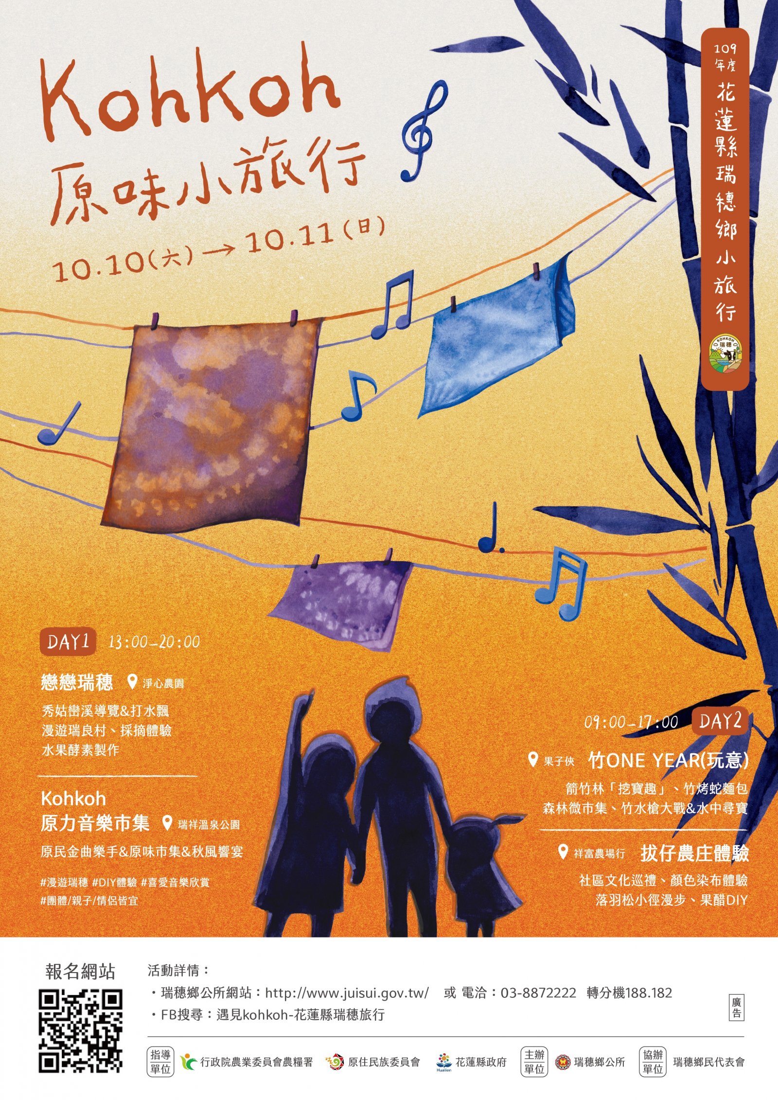 本遊程規劃自109年10月10日(星期六)下午1時整至109年10月11日(星期日)下午5時整,內容包含戀戀瑞穗、KohKoh原味音樂市集、竹ONE YEAR(玩意)、拔仔農庄體驗等活動。