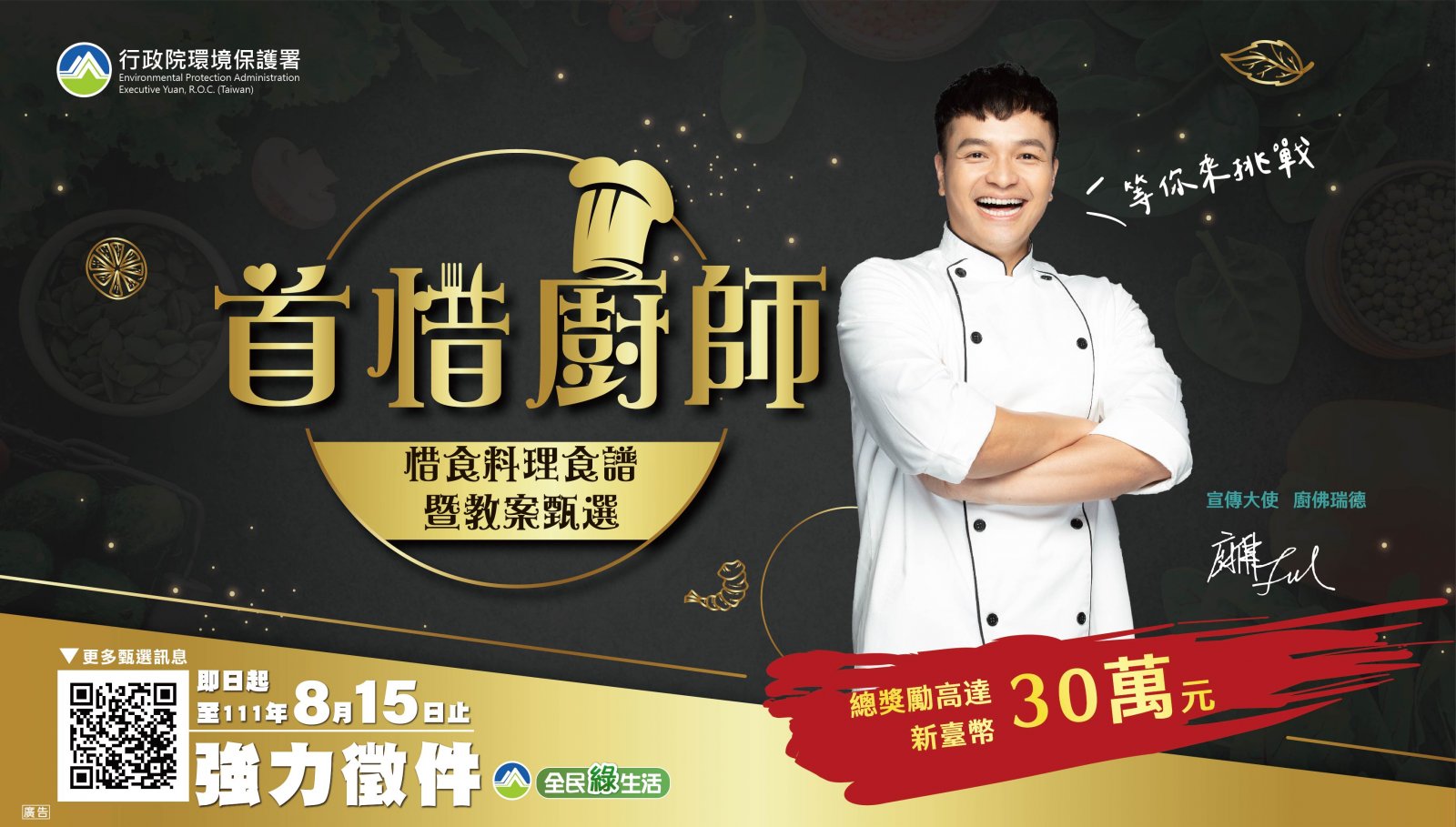 一、 為喚醒社會大眾珍惜食物(下稱惜食)的覺知、知識、態度、技能進而產生行動,並鼓勵於生活中落實惜食理念,該署特辦理本甄選活動,廣邀各界一同參與,開創臺灣料理的新食代!