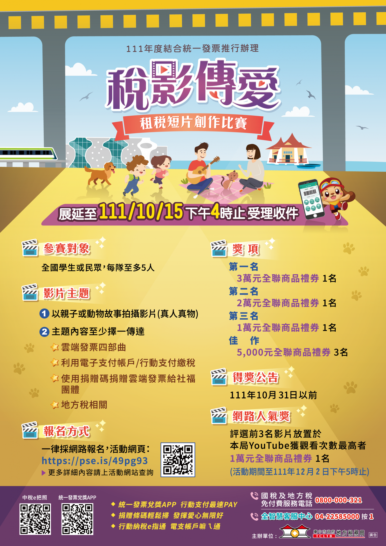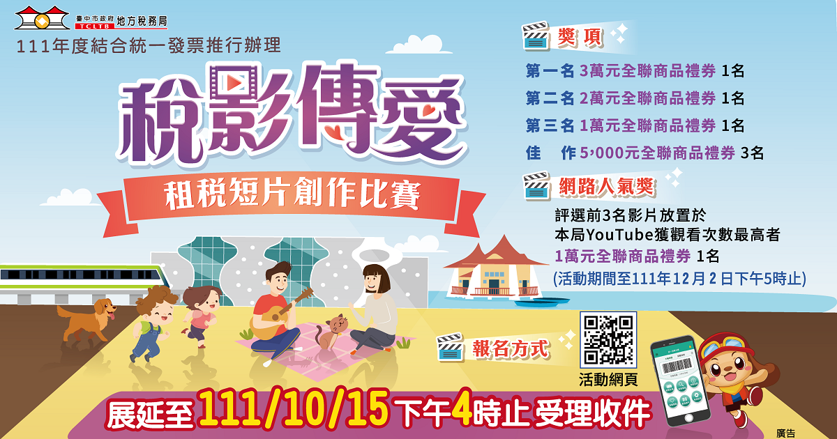 一、臺中市政府地方稅務局辦理111年度「稅影傳愛」租稅短片創作比賽收件截止日延至10月15日,鼓勵民眾踴躍參加並協助宣導。