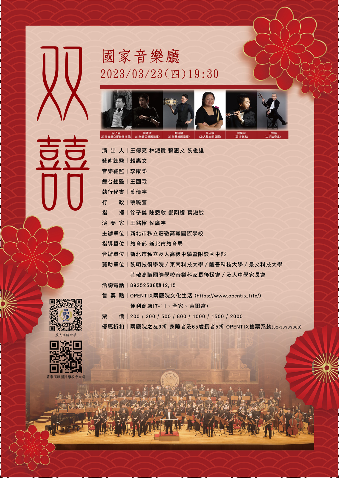 一、新北市私立及人高級中學擊樂團,訂於112年3月23日(星期四)於國家音樂廳舉辦「双囍」音樂會。