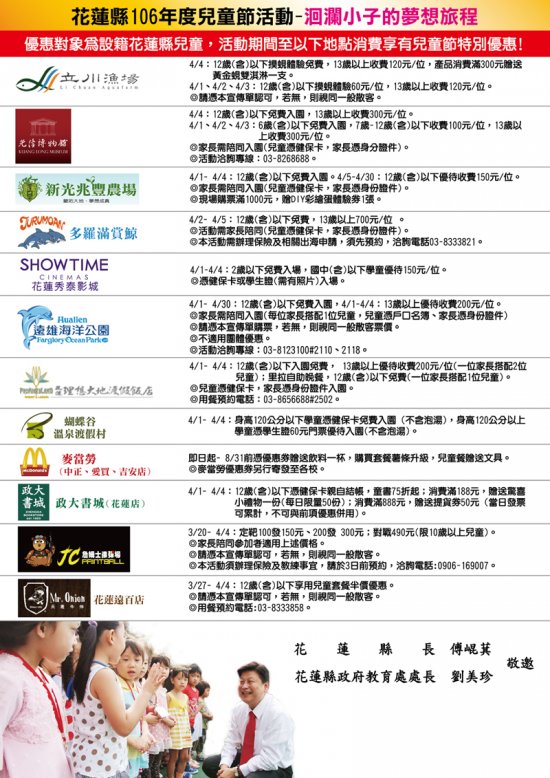 為歡慶一年一度兒童節,由縣政府號召縣內設有文教及遊樂設施等12家知名企業共同合作,於兒童節期間(106年4月1日~4月4日)舉辦「洄瀾小子的夢想旅程」活動,邀請本縣學童享有免費入場,大小朋友親子同樂更享有特別優惠,祝花蓮孩子兒童節快樂!