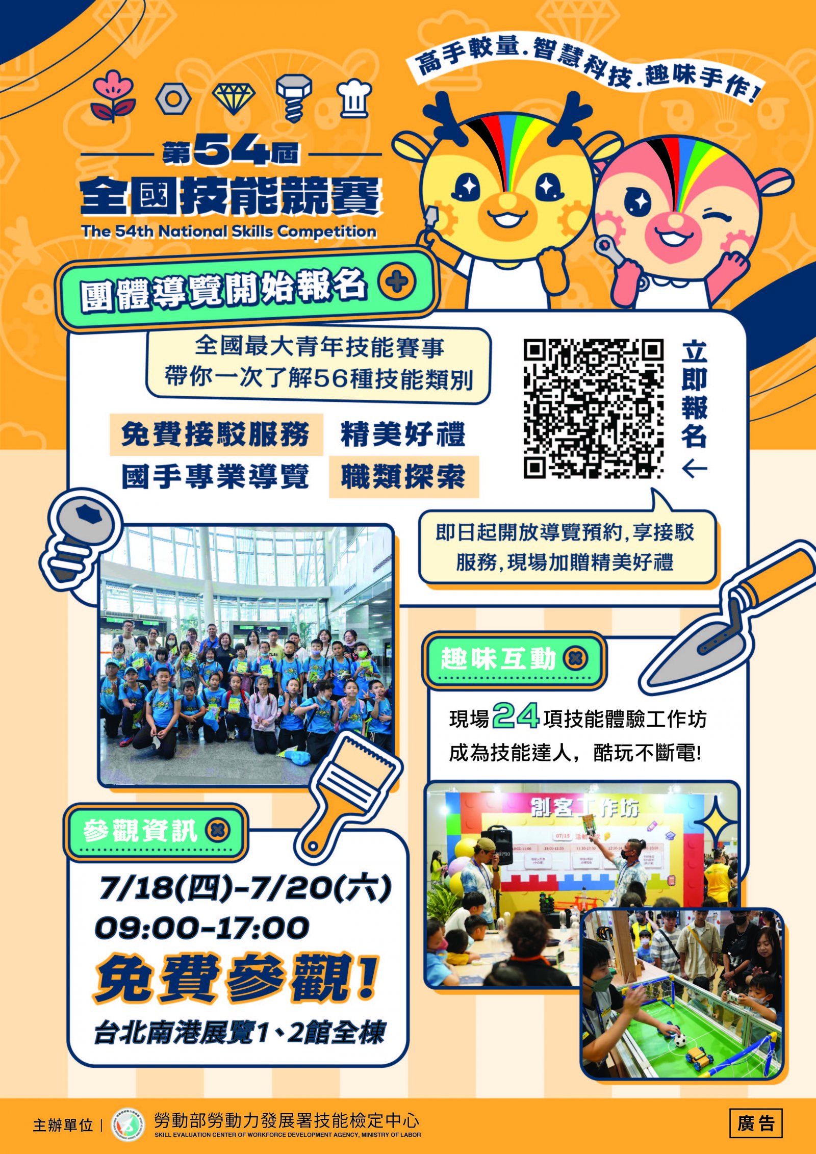 旨揭競賽活動訂於113年7月18日(星期四)至7月20日(星期六)假臺北市南港展覽館1、2館(臺北市南港區經貿二路1、2 號)舉辦,本次辦理青年組56職類與青少年組13職類,共計69職類,為職業訓練與技職教育之年度盛事。