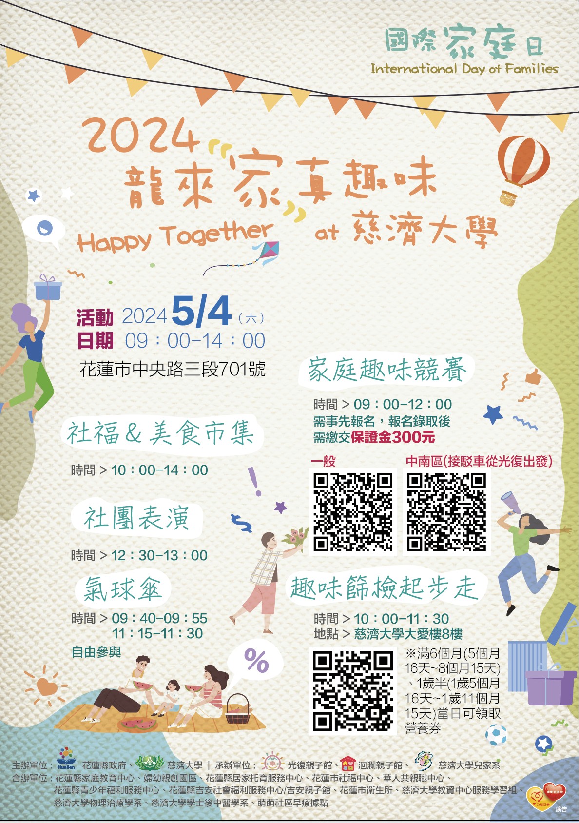| 一、 | 慈濟學校財團法人慈濟大學兒童發展與家庭教育學系長期關注以「家庭」議題與教育,與承接之光復及洄瀾親子館合辦5月國際家庭日活動,希望透過家庭合作競賽的方式凝聚不同年齡層的家庭,從遊戲中達到親子合作、互助及團隊力。 |