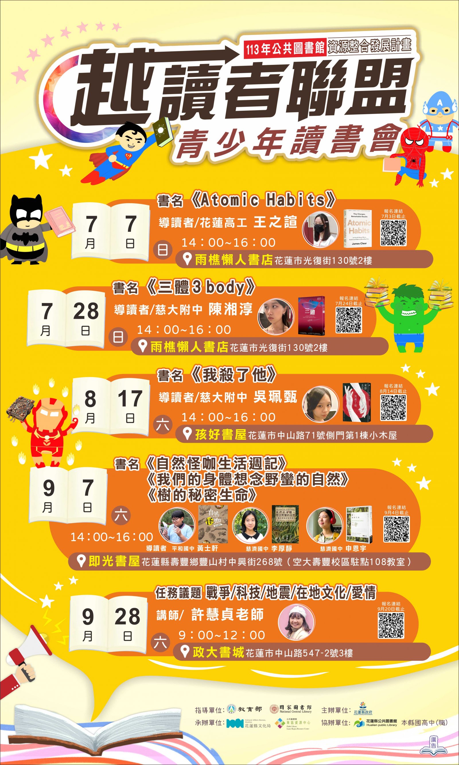 花蓮縣文化局辦理「113年公共圖書館資源整合發展計畫-越讀者聯盟-青少年讀書會」更改地點案,宣導週知並鼓勵同學踴躍參加,請查照。