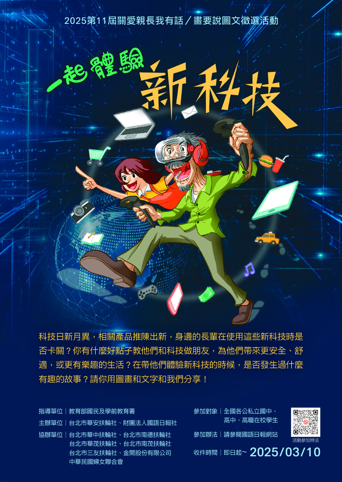 為鼓勵高級中等學校及國民中學學生勇於表達對親長的關愛,財團法人國語日報社與臺北市華安扶輪社共同辦理第11屆「關愛親長 我有話/畫要說」圖文徵選活動,並自即日起至114年3月10日(星期一)止徵件。參加辦法請參見附件,或逕自國語日報社網站下載( https://www.mdnkids.com/events/20241115-talkdrow/ )。