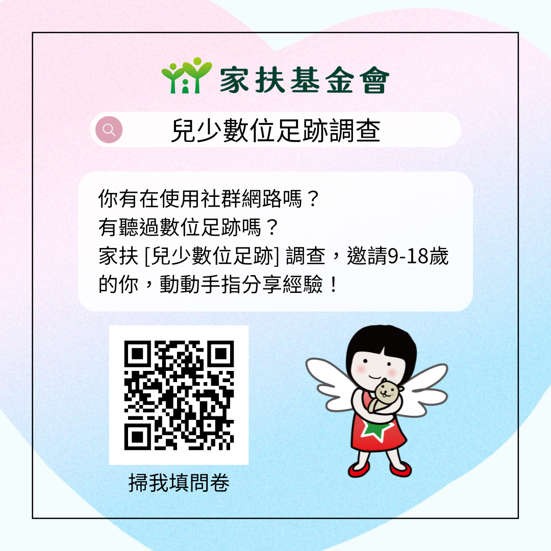 二、財團法人台灣兒童暨家庭扶助基金會長期關注兒童及少年權益發展與實踐,為了解我國兒童及少年運用社群媒體/網路使用與數位足跡之情形,期以此主題進行調查和倡議工作。