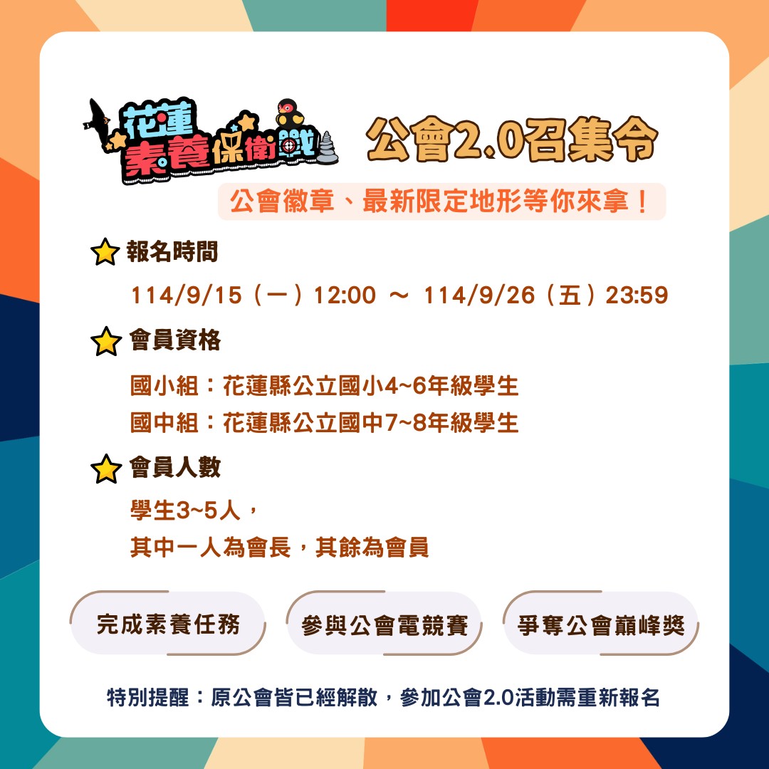 | 一、 | 旨案為結合「素養任務挑戰」、「知識電競」與「公會經營」的年度活動。學生將組隊成立公會,透過完成中文閱讀素養任務、參加每月電競賽來獲得公會積分,藉由團隊合作與友善競爭,促進深度學習與素養內化。 |